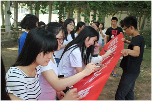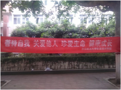 四.5月18日在雁塔校区小花园进行了心理趣味游戏活动,游戏活动中学生们的热情空前高涨,尤其是我院副书记王国庆老师和辅导员晋艳老师的参加,将整个心理健康活动推向了高潮,活动结束后老师和同学们集体在宣传横幅上签字并拍照留念。