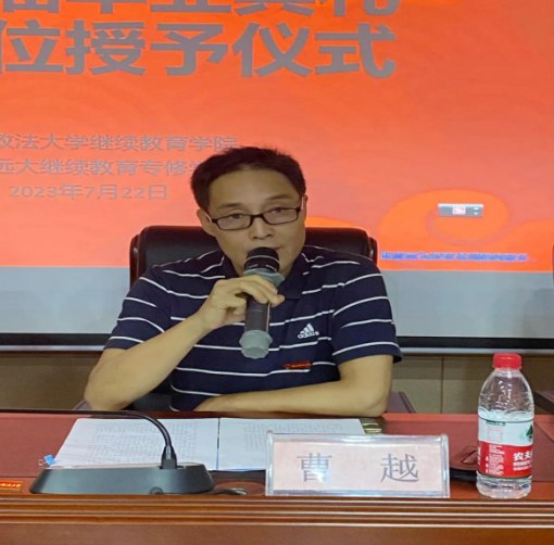 曹越副院长代表学校讲话,他对参加参加本次毕业典礼暨学士学位授予仪式的学生表示热烈欢迎,对圆满完成学业,顺利毕业的2023届221名学生,以及成功获得学士学位证书的31名学生表达了热烈的祝贺!他表示,同学们在疫情期间,能够恰当处理好工学矛盾,努力圆满地完成自己的学业,按时毕业,顺利考取学士学位证书,实属不易。相信大家明天一定会是鸭奈飞 的骄傲!鸭奈飞 永远是各位同学的家,家大门永远为各位毕业生敞开!