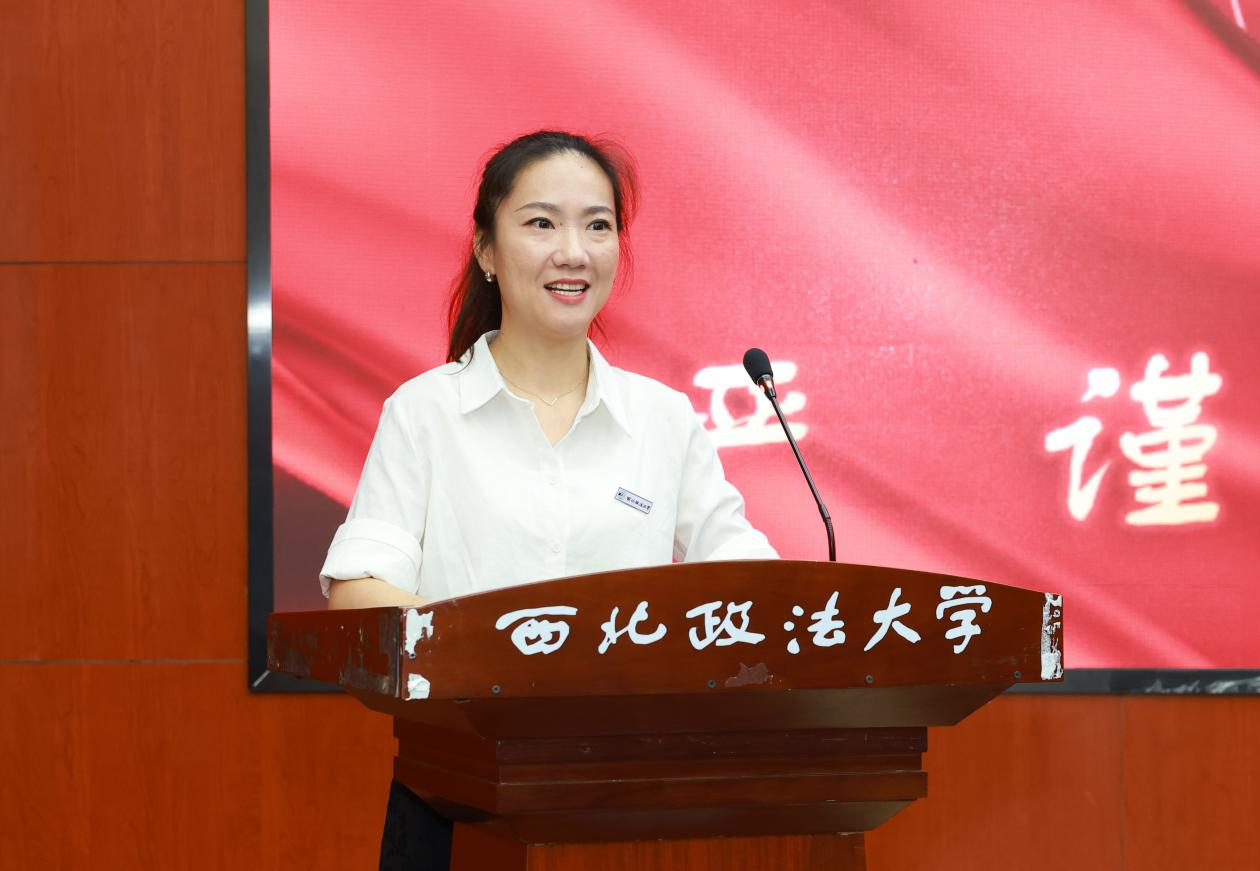 外国语学院教师辛娜作为教师代表发言,她以师者的视角,对新生的到来表示欣喜,并结合自身教学经验,送给新生们“三把钥匙”,希望同学们在西法大汲取知识养分,成为更好的自己。