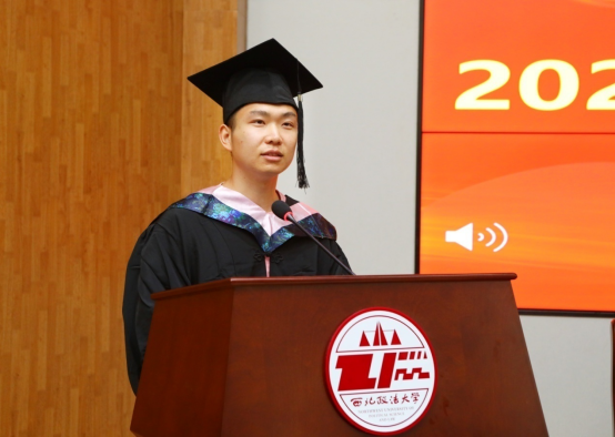 赵全宇副校长代表学校,向全体毕业生们表示最热烈的祝贺和最殷切的希望。一是要勤于修身,传承好西法大的红色基因。同学们要将修身作为一辈子的实践过程,坚持不懈用红色基因滋养初心、淬炼灵魂。二是要善于学习,不断提高干事创业本领。切实通过学习,打下扎实理论功底,培养创新思维方式,积蓄能力底气,赢得主动、赢得优势、赢得未来,努力成为可堪大任的有用之才。三是要勇于担当,展现奋发作为气象。把个人发展融入中国式现代化建设的伟大实践中,在为大局争光添彩中实现自己的人生价值。